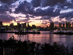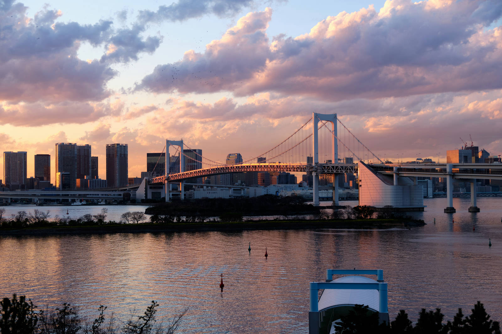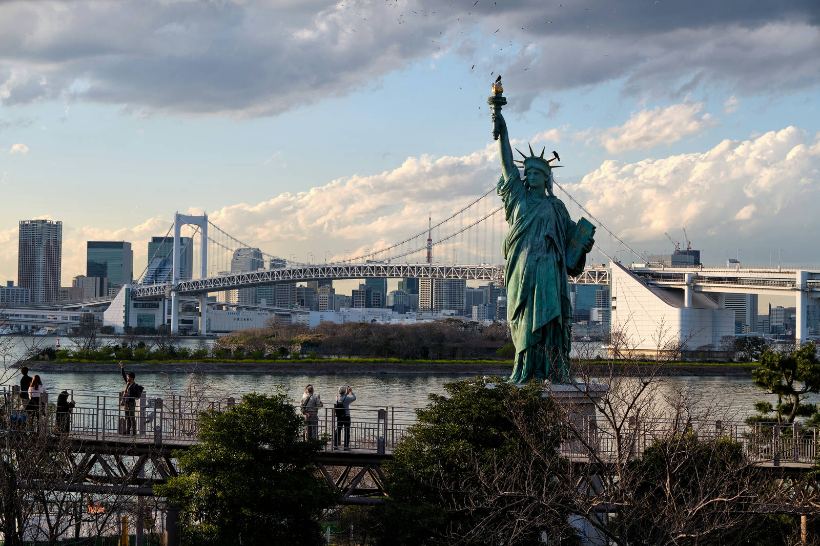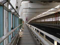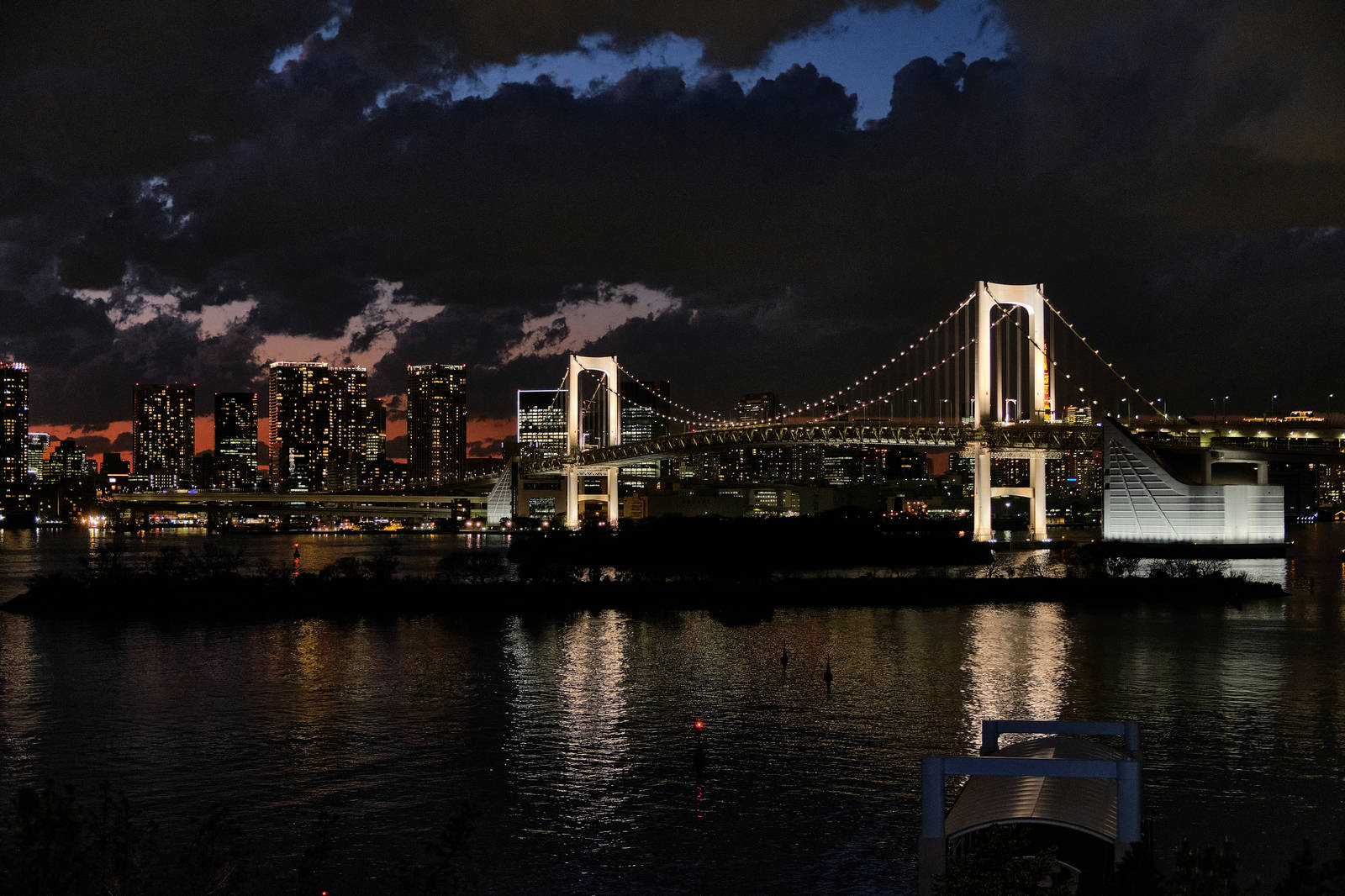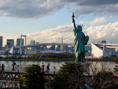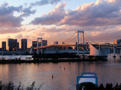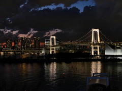 Abends hat es mich dann noch nach Odaiba verschlagen, das ist eine künstliche Insel in der Bucht von Tokyo. Dort hin kommt man über die allseits bekannte Rainbow Brige, über die kann man auch zu Fuß, oder mit dem Fahrrad ... dann bekommt man allerdings so eine Art Parkkralle mit Rollen dran ans Hinterrad damit man auch auf jedenfall schiebt. Odaiba selbst wirkt recht modern, viele offene Plätze, breite Fußwege eine Etage weg vom restlichen Verkehr, großer Kampfroboter und fahrrerloser Bahn auf Viadukt. Ansonsten gibt's dann aber doch hauptsächlich Edel-Shoppingmalls zu sehen, und einen ziemlich geilen Blick auf die Skyline Tokyos.
