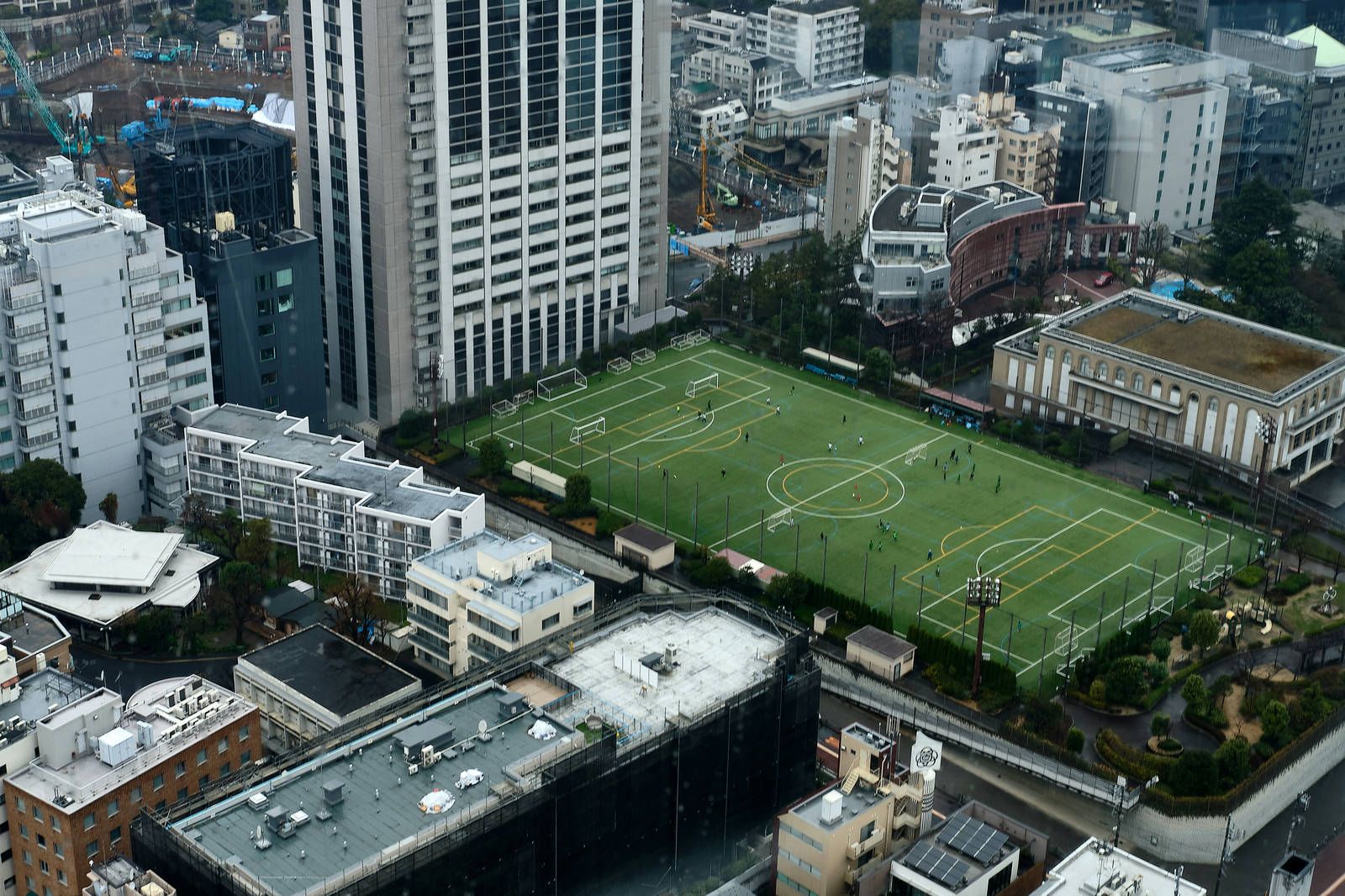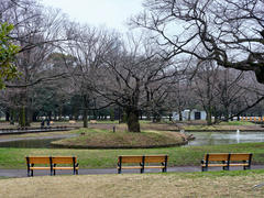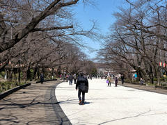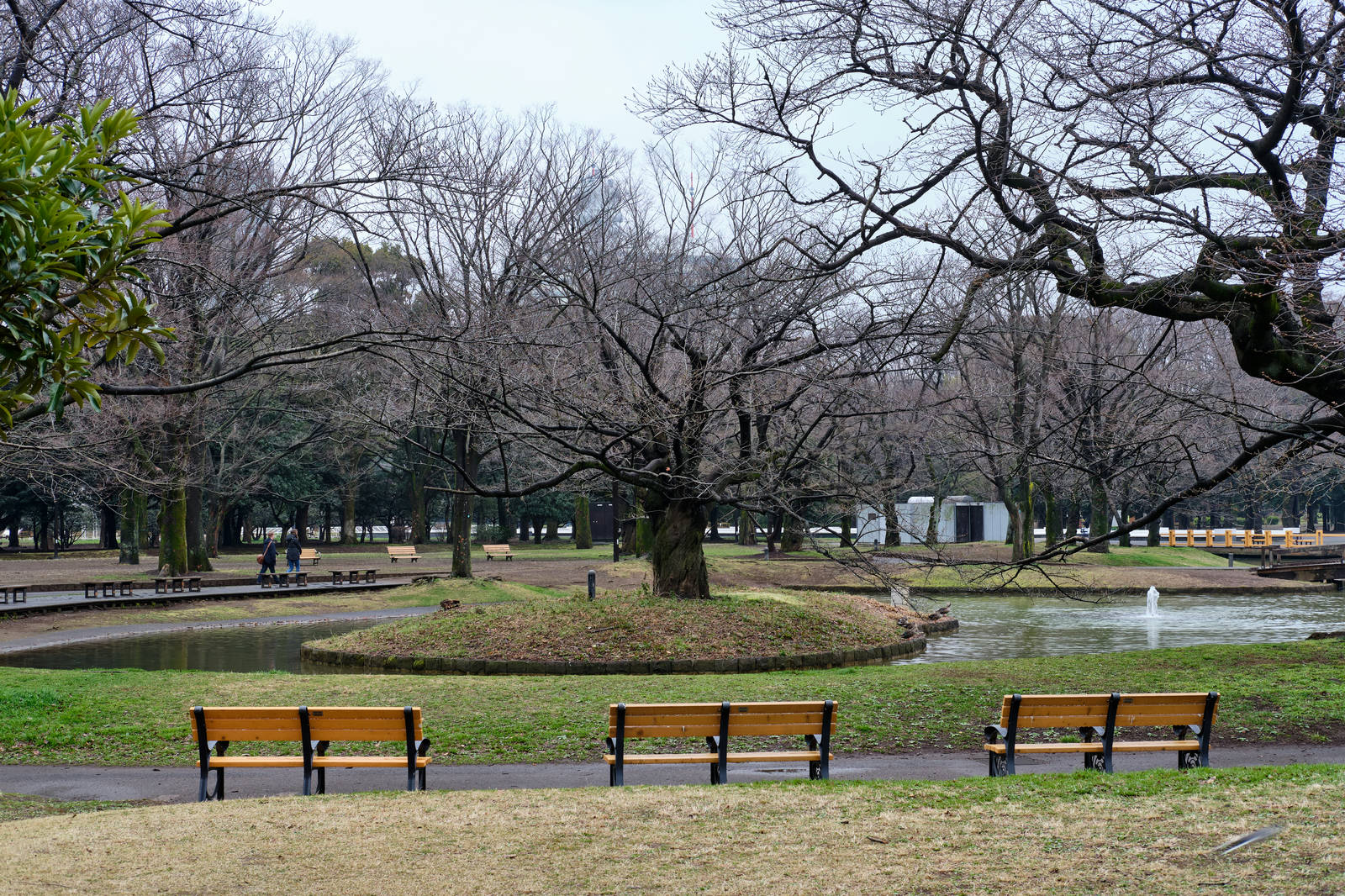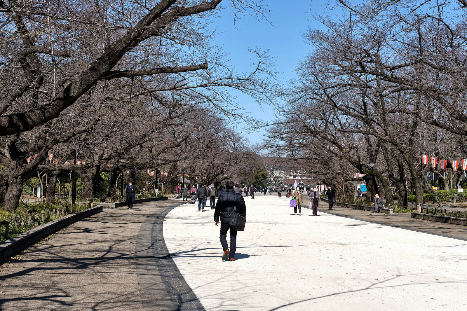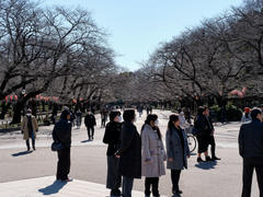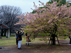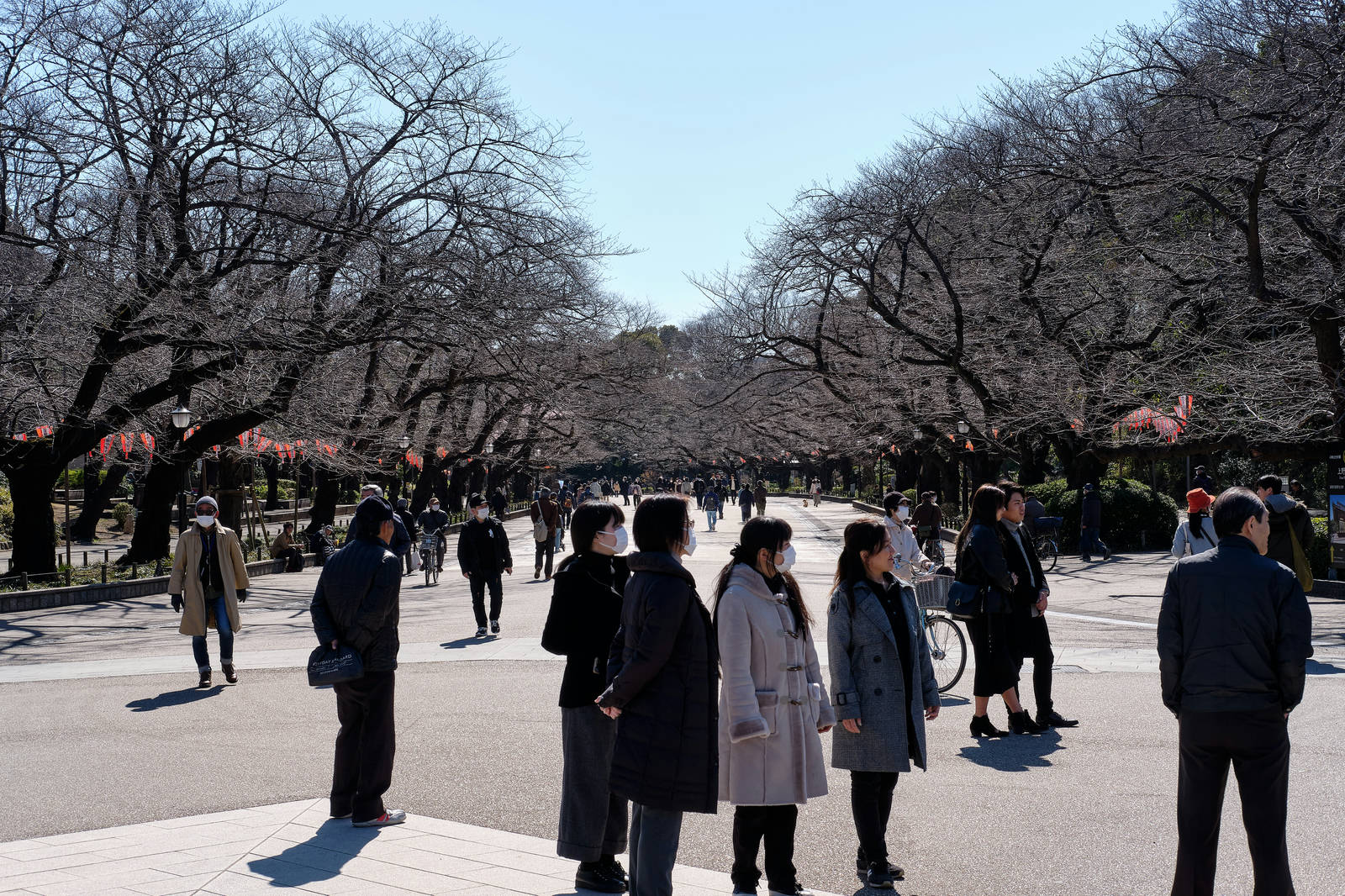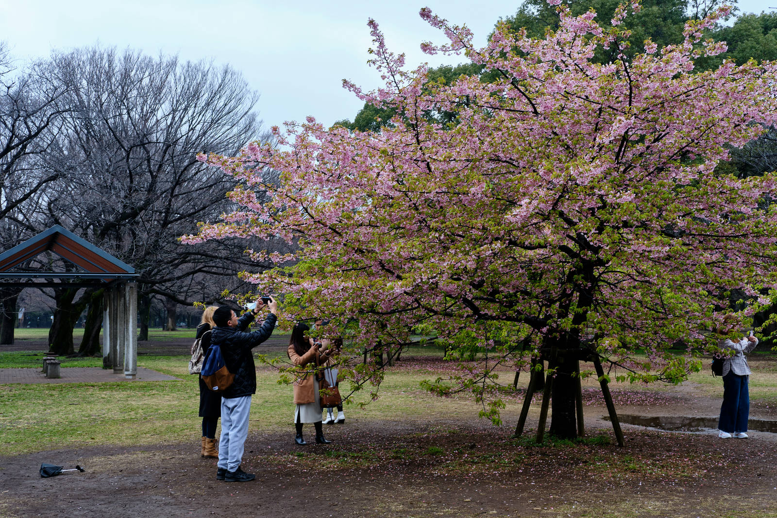 Der Tokyo Tower selbst war dann eher unspektakulär—hochfahren, rausgucken, fertig. Immerhin wurde kostenfrei Fieber gemessen. Rückzugs ging's dann durch den Yoyogi Park, eher trist bei der Jahreszeit und dem Wetter, aber es hat tatsächlich schon ein Kirschbaum geblüht ... gut erkennbar an den Instagrammern außenrum.