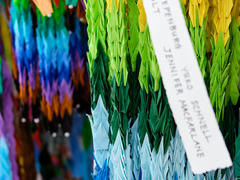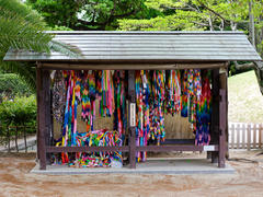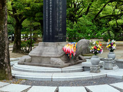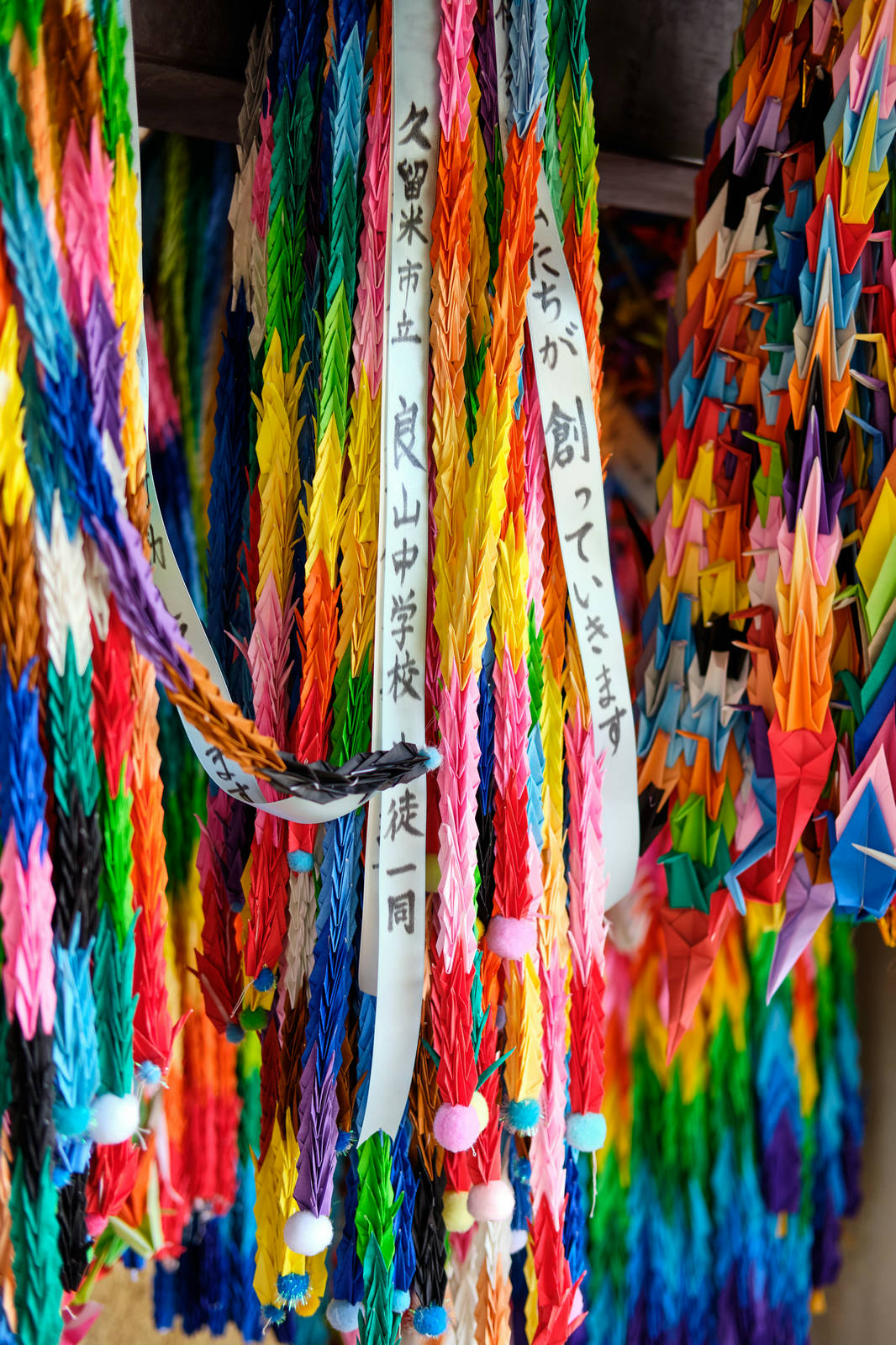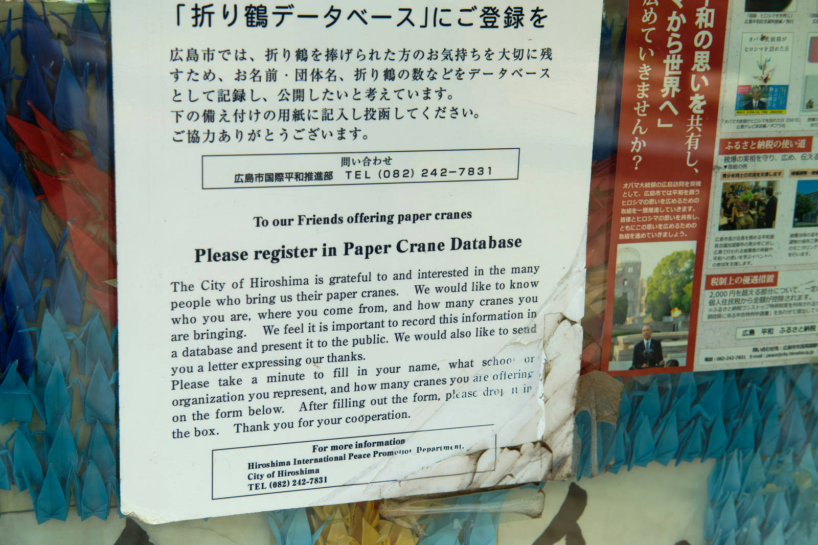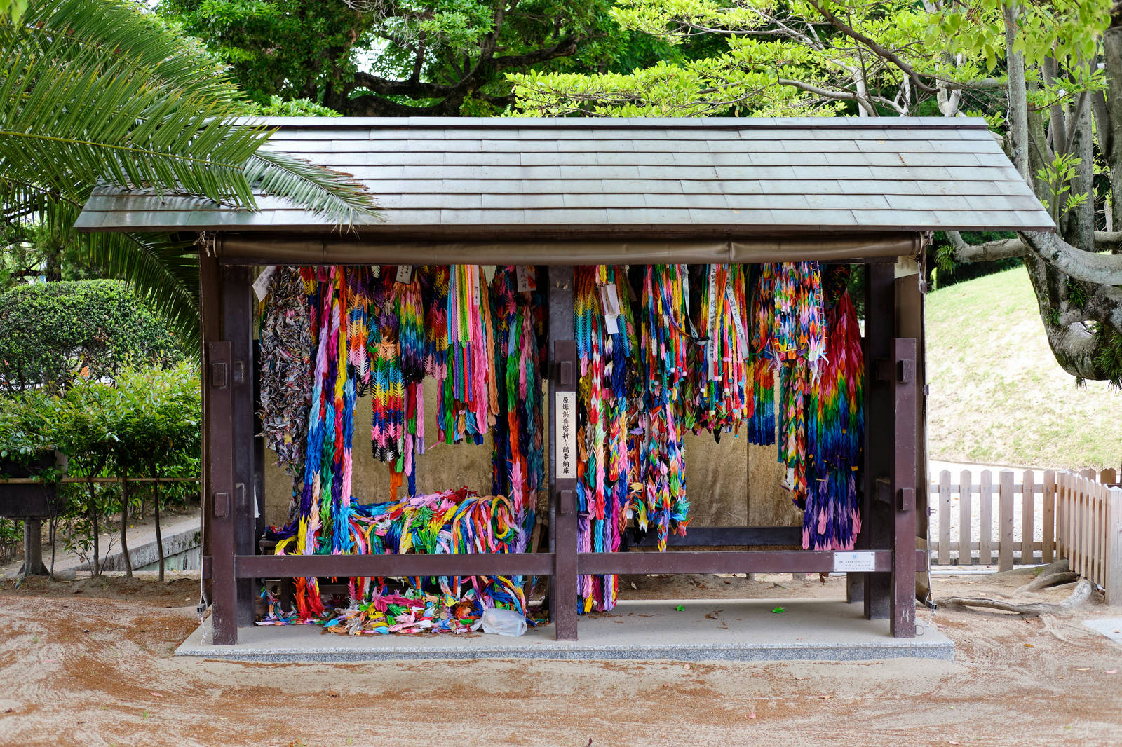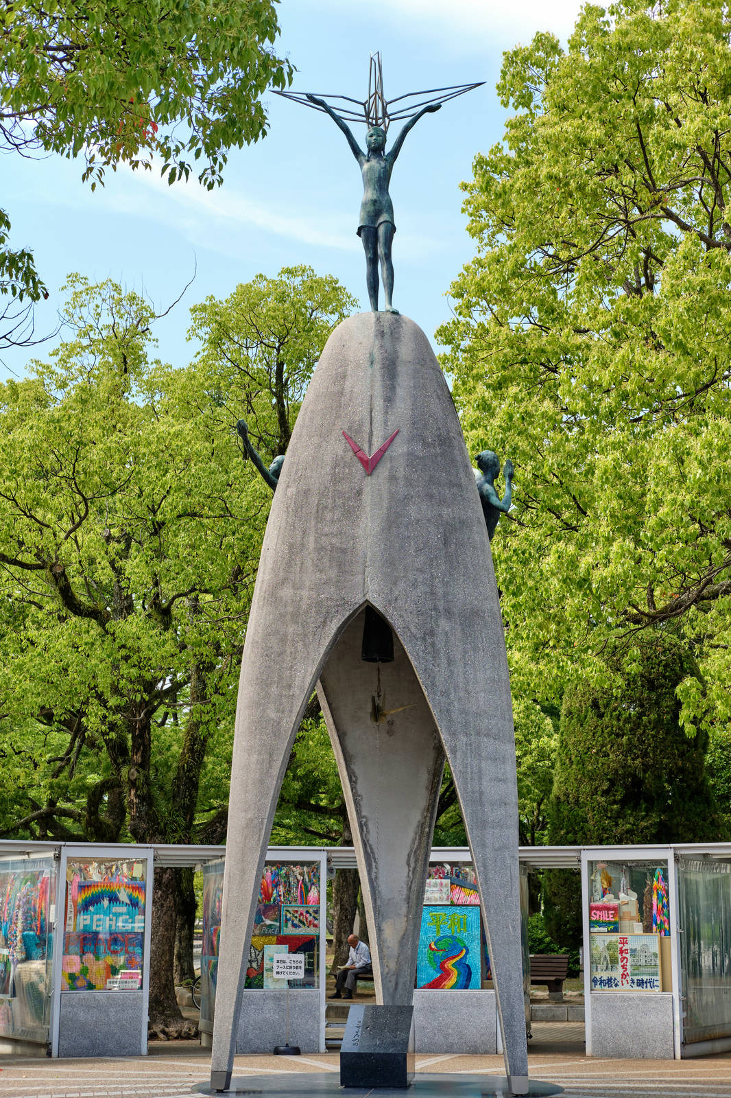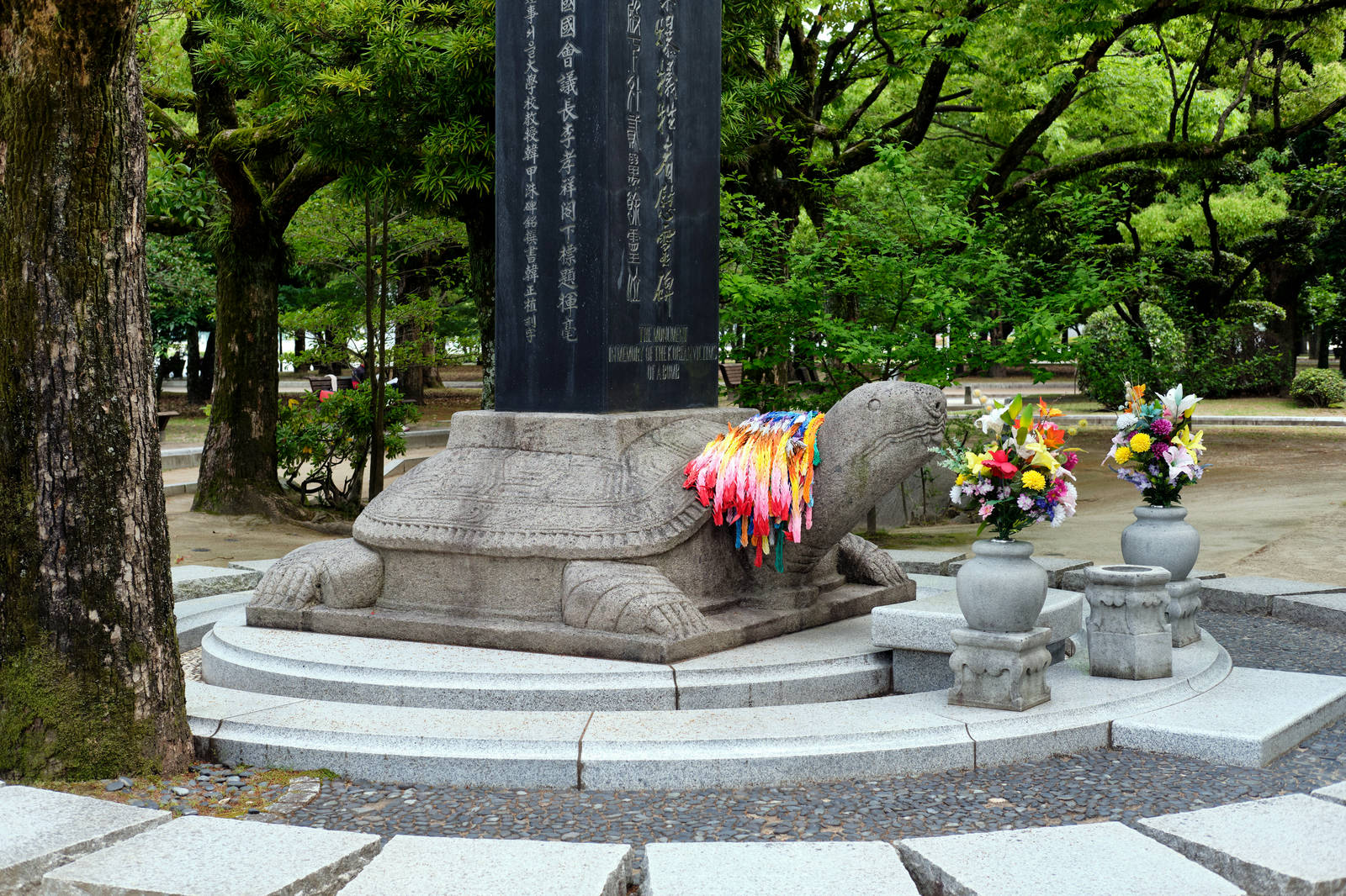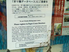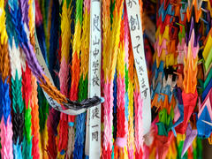 Die meisten der oben genannten Friedens...ähm...dinge liegen im Friedenspark neben der Atombombenkuppel. Dort findet man in großer Zahl überall Papierkraniche (Achtung: Nicht mit dem Flattervogel verwechseln, der wird leicht anders gefaltet!) verteilt, die von Leuten aus aller Welt gespendet worden sind. Auch im Rest der Stadt wird einem der Kranich häufig als Symbol über den weg laufen. Wer wissen will, was es damit auf sich hat, darf gerne mal die Geschichte der Sadako Sasaki nachlesen, ein paar der original Kraniche finden sich übrigens auch im Friedensmuseum.