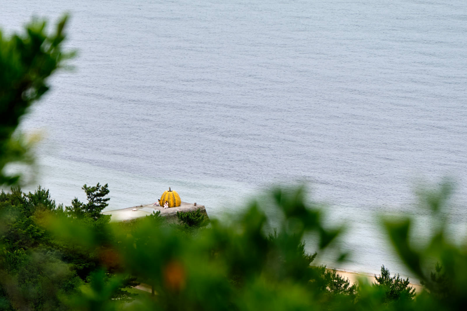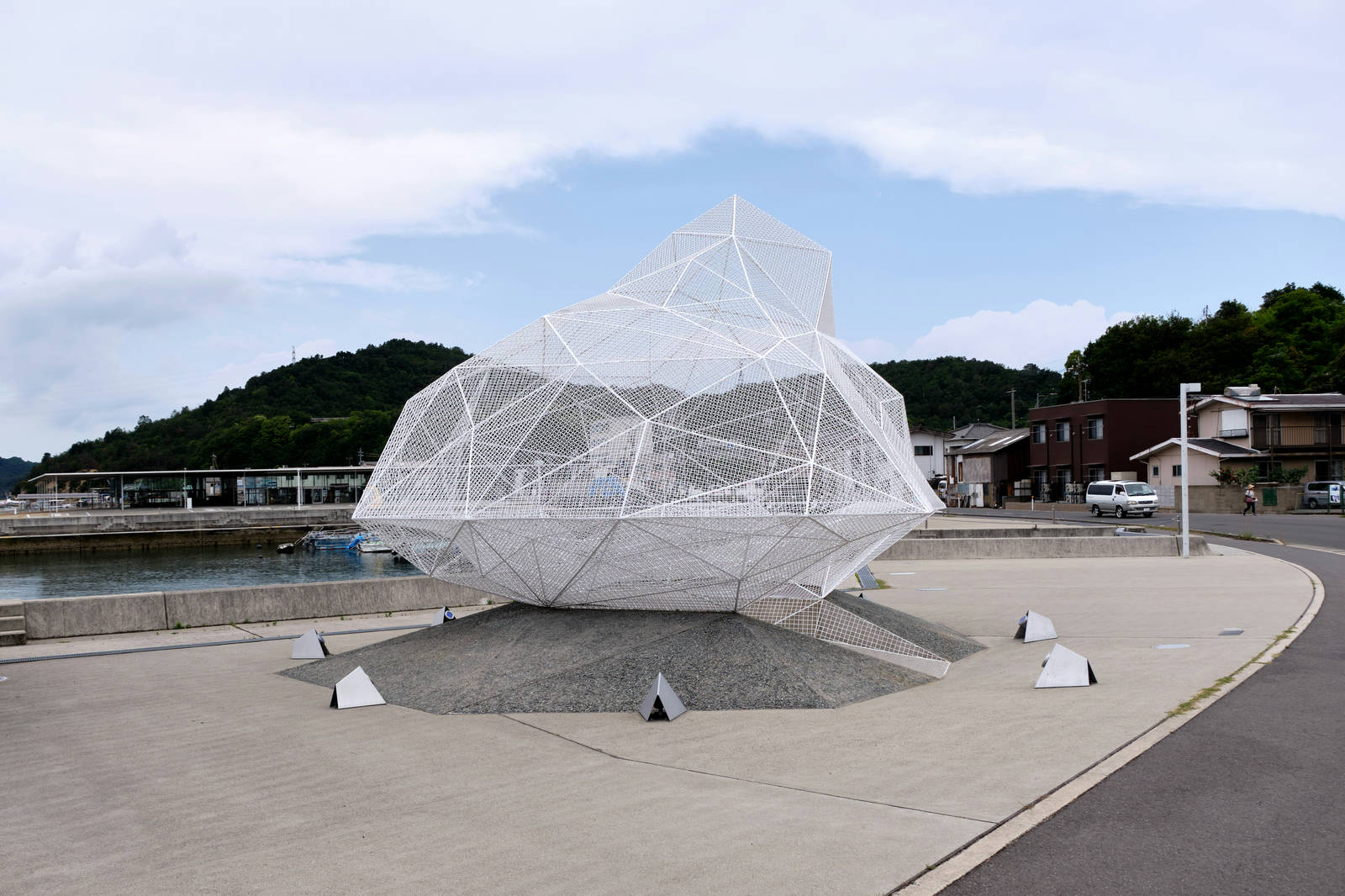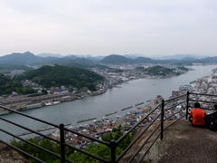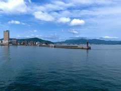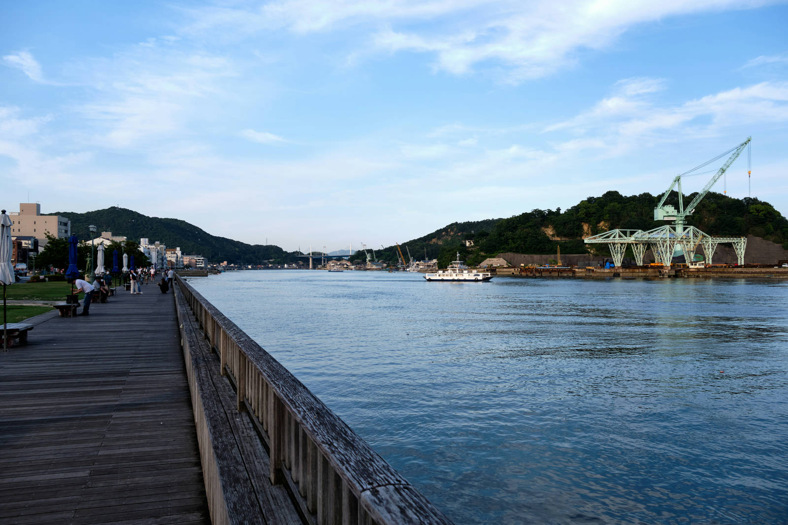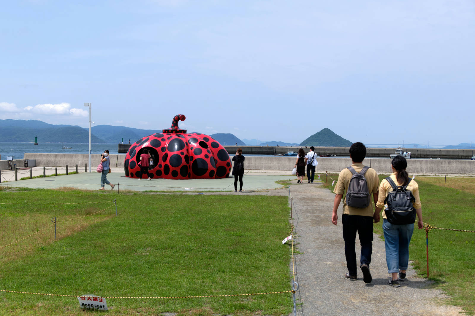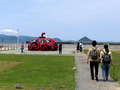 Nach einer eher unspektakulären Etappe an der Küste entlang bin ich dann in Takamatsu gelandet, von dort aus geht es wieder auf die Hauptinsel Honshu zurück. Allerdings per Fähre, denn die Shimanami Kaido ist die einzige der drei Verbindungen die ohne Auto oder Zug funktioniert. Da es keine direkte Fährverbindung mehr gibt, hab ich noch einen Zwischenstopp auf Naoshima eingelegt. Eigentlich eine ganz idyllische kleine Insel, deren komplette Umrundung jedoch daran scheiterte, dass der Norden von Mitsubishi Chemical und der Süden von der Benesse Corporation beansprucht wird. Letztere hat auf der Insel diverse moderne Kunstinstallationen, ein Kunsthotel und Kunstmuseen installiert, was recht viele Touristen auf die Insel zieht. Dass der Kunstteil nicht per Fahrrad zugänglich ist, wurde mir von einer doch recht britisch wirkenden Dame (keine Ahnung ob das Teil der Kunstinstallation war) mitgeteilt, die mich dann auf einen "etwas steilen" Weg außenrum verwies – nochmal fall ich auf den Trick nicht rein. Im Hafen vom Tamano auf Honshu stand dann noch mehr Kunst rum.
