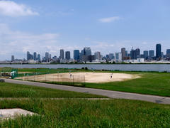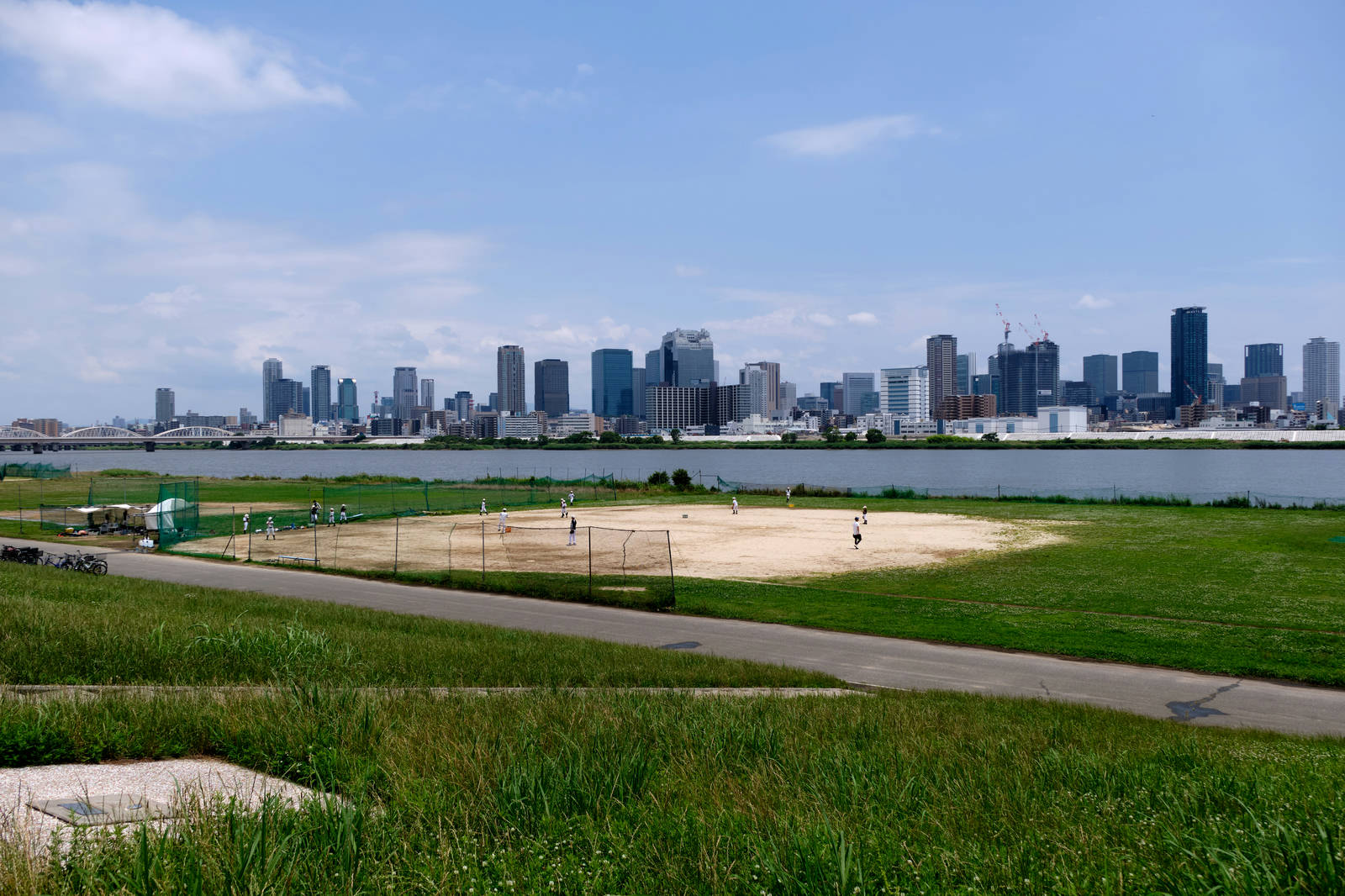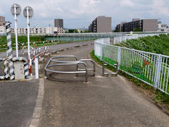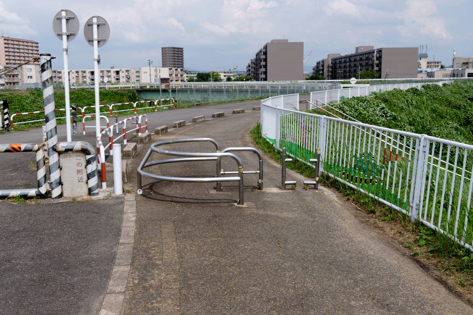Auf die letzte Etappe nach Kyoto hatte ich eigentlich recht wenig Lust, denn ab Kobe beginnt die Bucht von Osaka – neben der Kanto Ebene, in der Tokyo liegt, das zweite große Ballungsgebiet – in der alle Städte inzwischen nahtlos zusammengewachsen sind, und in der Stadt fahren macht recht wenig Spaß. Aber es stellte sich raus, ab der Stadtgrenze zu Osaka gibt es einen Fluss, und daran entlang führt ein breiter Radweg 60 km unterbrochen bis nach Kyoto. Weil Sonntag war, war da auch ordentlich was los. Die Polder um die Flüsse sind in den Stadtgebieten die einzigen großen freien Flächen, deswegen sind da haufenweise Baseballfelder (die wirklich alle belegt waren), Golfplätze und sonstige Sportanlagen, dazu massenweise Jogger, Spaziergänger, Radler und Saxophonisten (Okay, zumindest einer). Und meinen neuen Nemesis hab ich dort auch gefunden: Alle paar Kilometer gibt es vor kreuzenden Parkplatzeinfahrten Tore, die wohl Radfahren ausbremsen und motorisierte Gefährte abhalten sollen. Durch die kommt ein Standardfahrrad noch ganz gut durch ... mit Gepäck, Mamachari oder Rennrad hat man aber verloren, dann heißt es drüberheben und hoffen, dass man nirgendwo hängen bleibt. Glaubt mir, ich war nicht der einzige der geflucht hat.