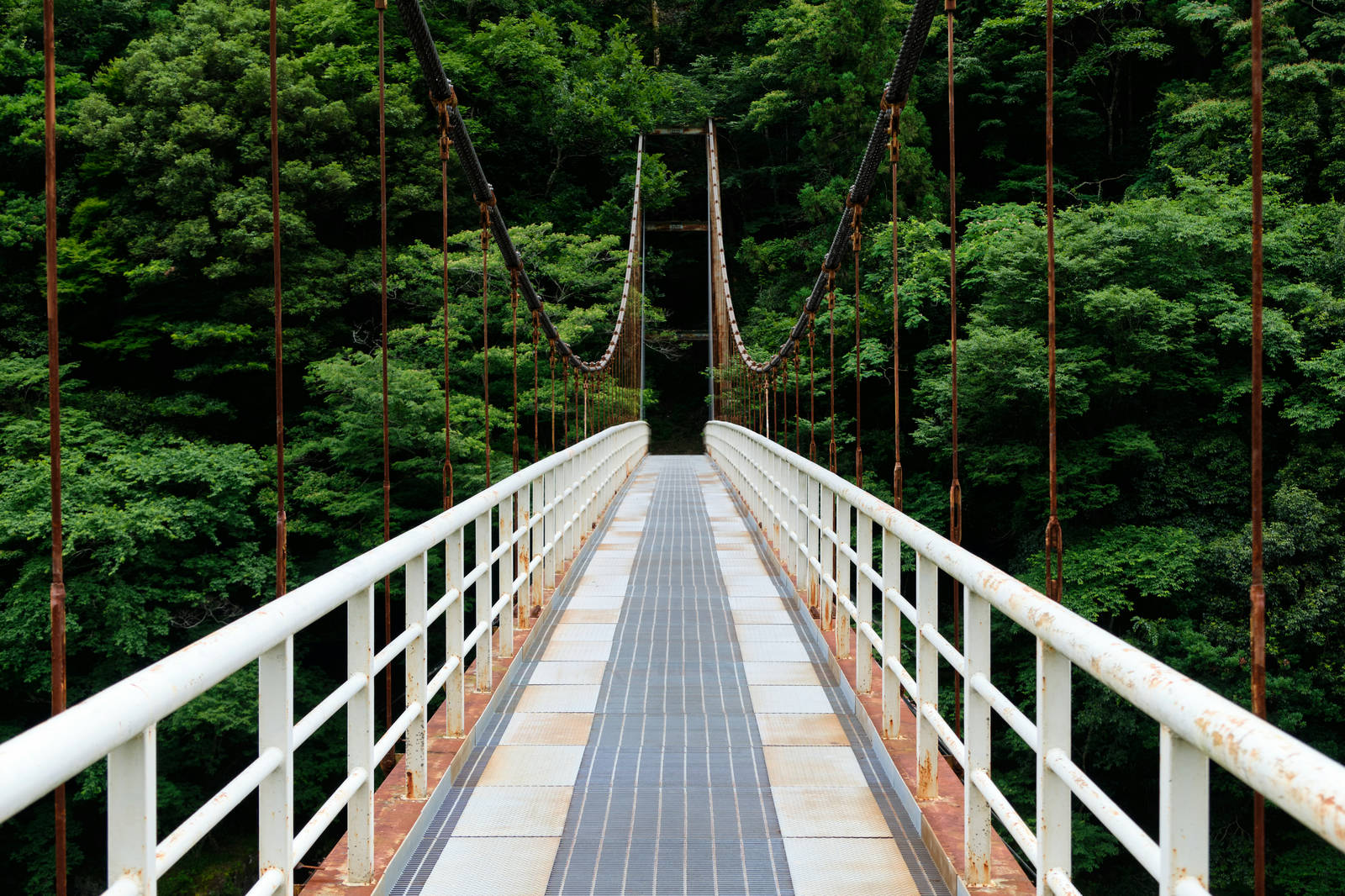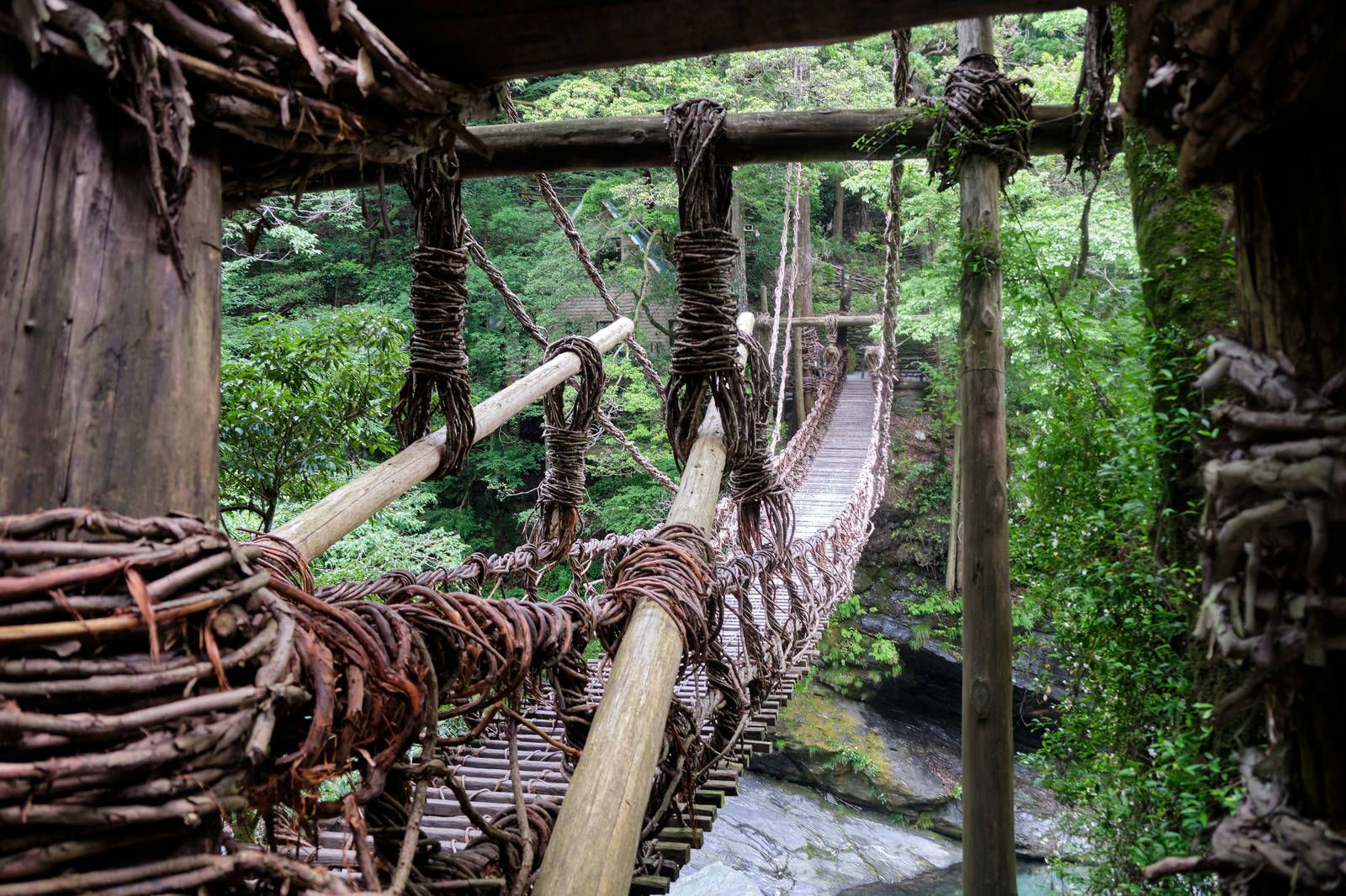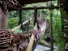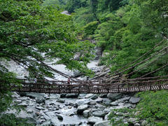 Weiter ging's ins Iya Tal, noch abgelegener, noch hübscher, noch ein Berg dazwischen. Obwohl da eine gut ausgebaute Bundesstraße hochführt, war die Steigung diesmal eher konstant und zermürbend ... und oben war auch noch ein Tunnel. Immerhin war da wegen Bauarbeiten ein Spur gesperrt und einer der Baustellenwinker hat mich (joggend !) über eben diese durch den Tunnel gelotst. Auf der anderen Seite kann man dann eine der früher genutzten Lianenbrücken bewundern, oder besser gesagt, die Leute die sich beim überqueren panisch an allem festklammern was da ist. Aus dem Tal raus führt eine leicht abschüssige, schön lange und wenig befahrene kurvige Bergstraße, die wirklich spaßig zu fahren ist. Die setzt einen aber auch wieder relativ abrupt im modernen Japan mit seinen endlos langen Gewerbegebieten ab. Dort lag auch mein 'Hotel' für die Nacht. Das war scheinbar ein umfunktioniertes Apartmentgebäude, vermutlich wollte niemand dauerhaft an einer viel befahrenen Straße mittig in einem Gewerbegebiet wohnen ... immerhin hab ich jetzt auch mal von innen gesehen womit sich der wenig verdienende Junggeselle in Japan abfinden muss.