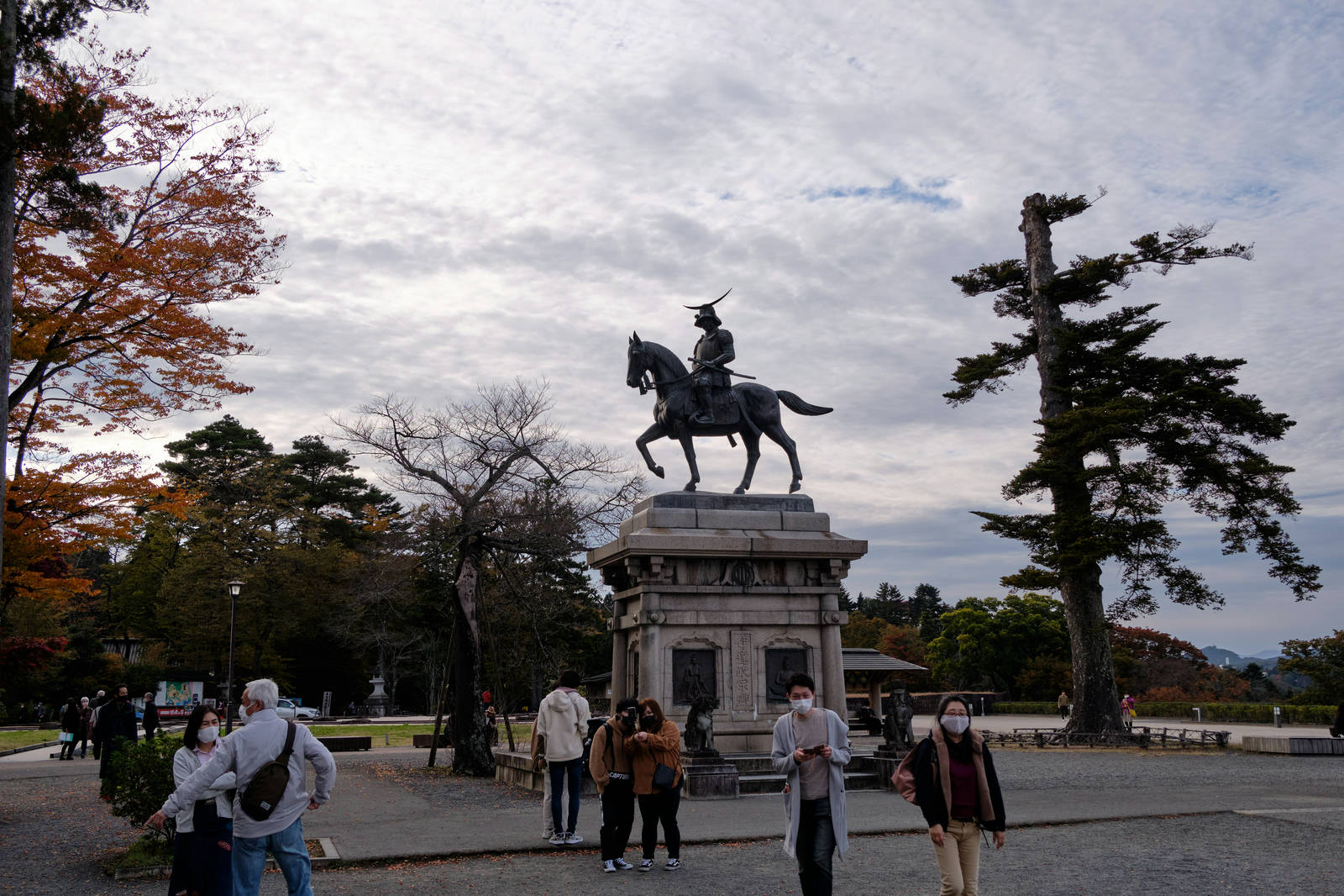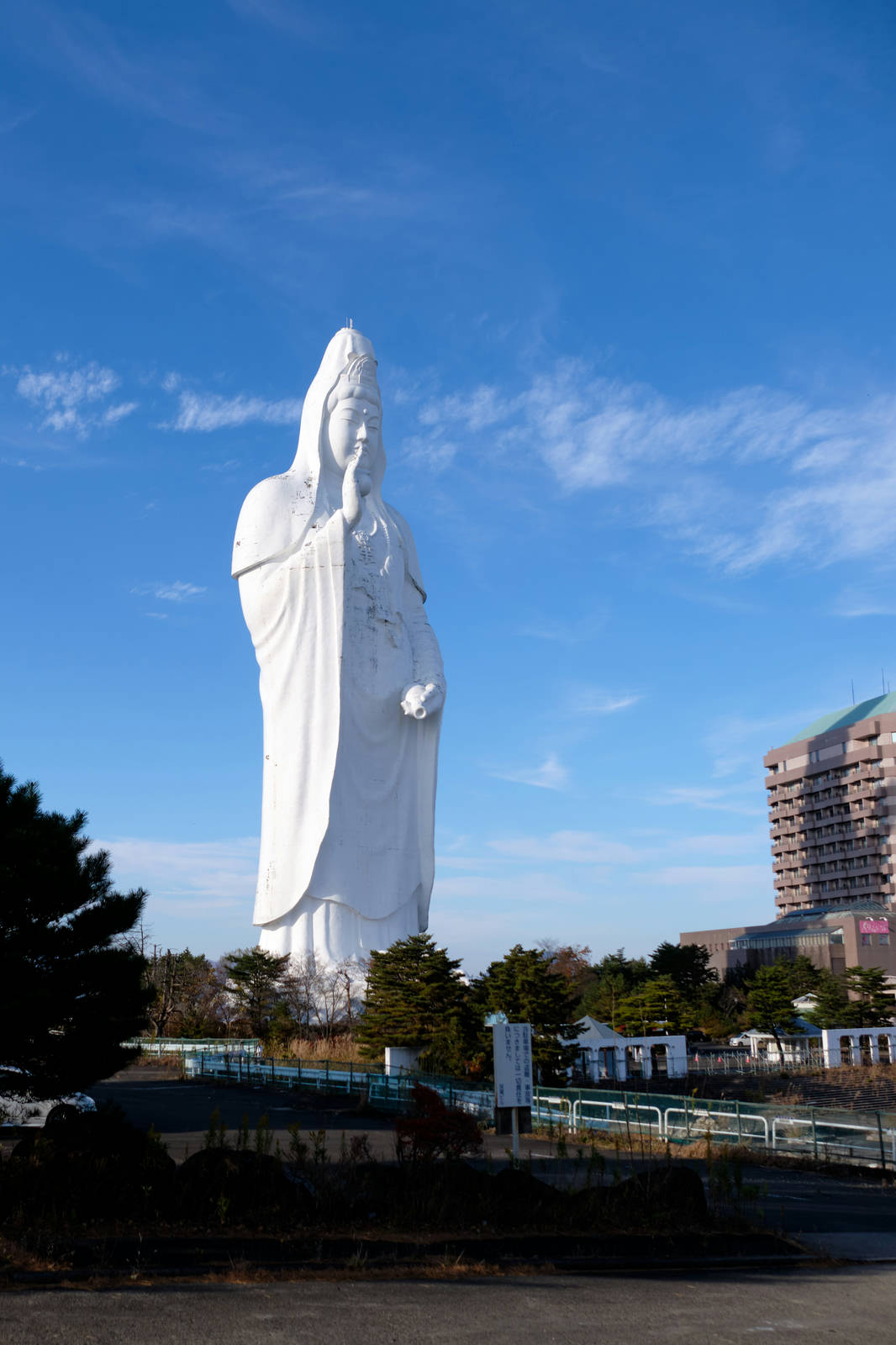 Apropos Essen, Sendais Spezialität ist Gyuutan, gegrillte Rinderzunge, erstaunlich wenig Zäh und erstaunlich Schmackhaft. Daneben gibt's noch Zunda, eine sehr grüne süße Paste aus Sojabohnen, mit der allerlei Süßspeisen modifiziert werden, die aber vor allem besonders gut als Milkshake funktioniert. Neben den Parks, in denen man die zur Jahreszeit passenden Laubfarben bewundern kann, gibt es auch noch die übliche nicht mehr vorhandenen Burg mit Ausblick über die Stadt ... und eine riesige Buddhastatue. Die steht in einem etwas abgelegenen Gewerbegebiet und wurde nicht von einer Religionsgemeinschaft sondern einer Firma mit wohl zu viel Geld errichtet, dementsprechend ist das Ding bei den Einheimischen auch eher unbeliebt.