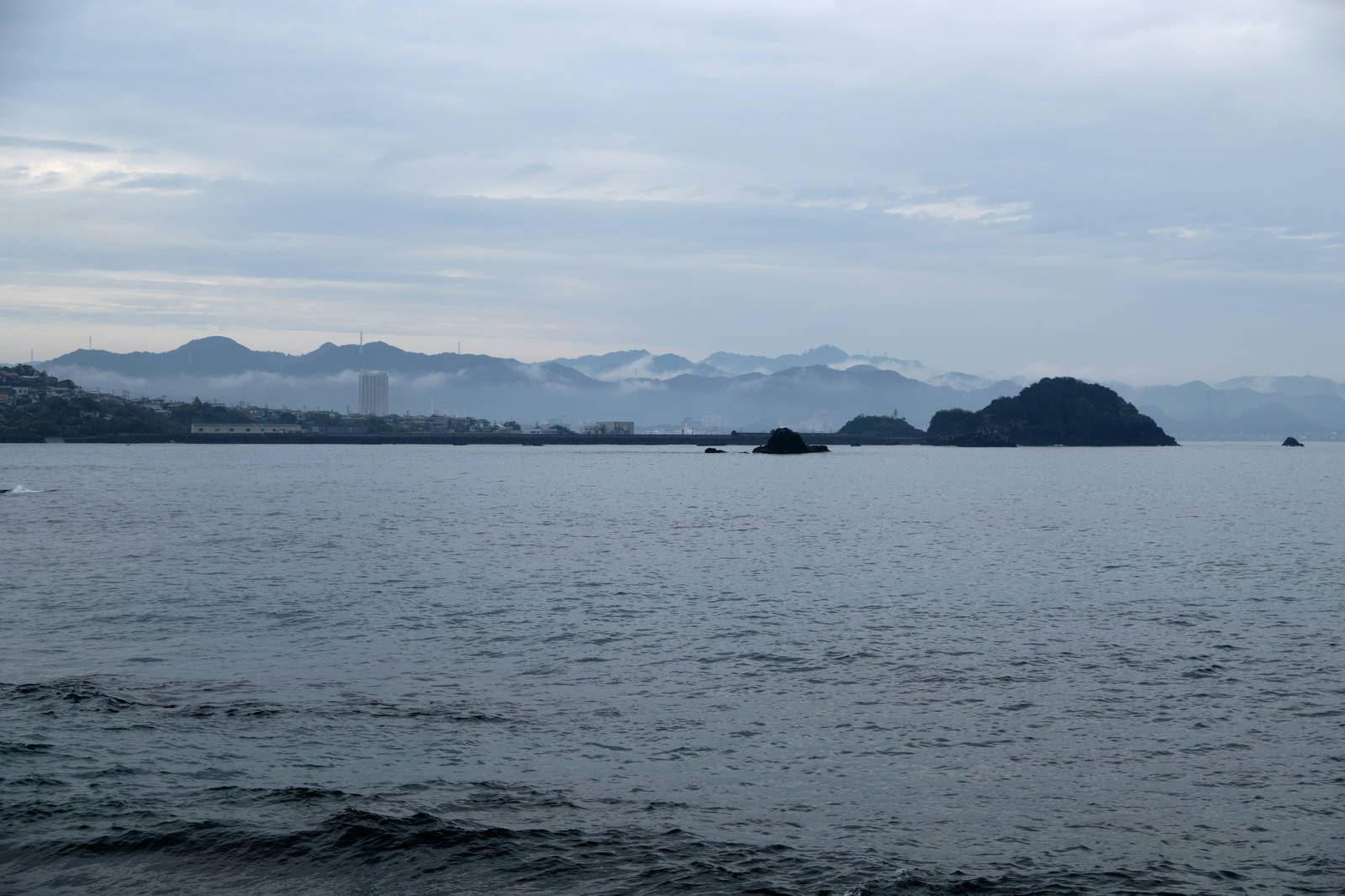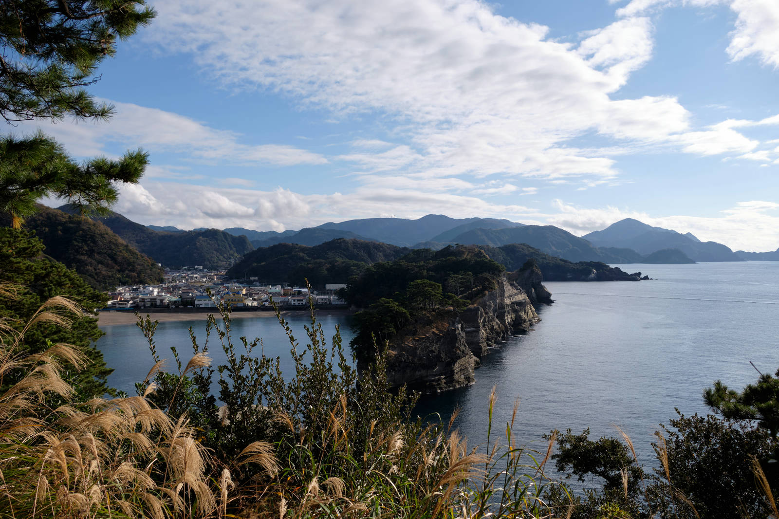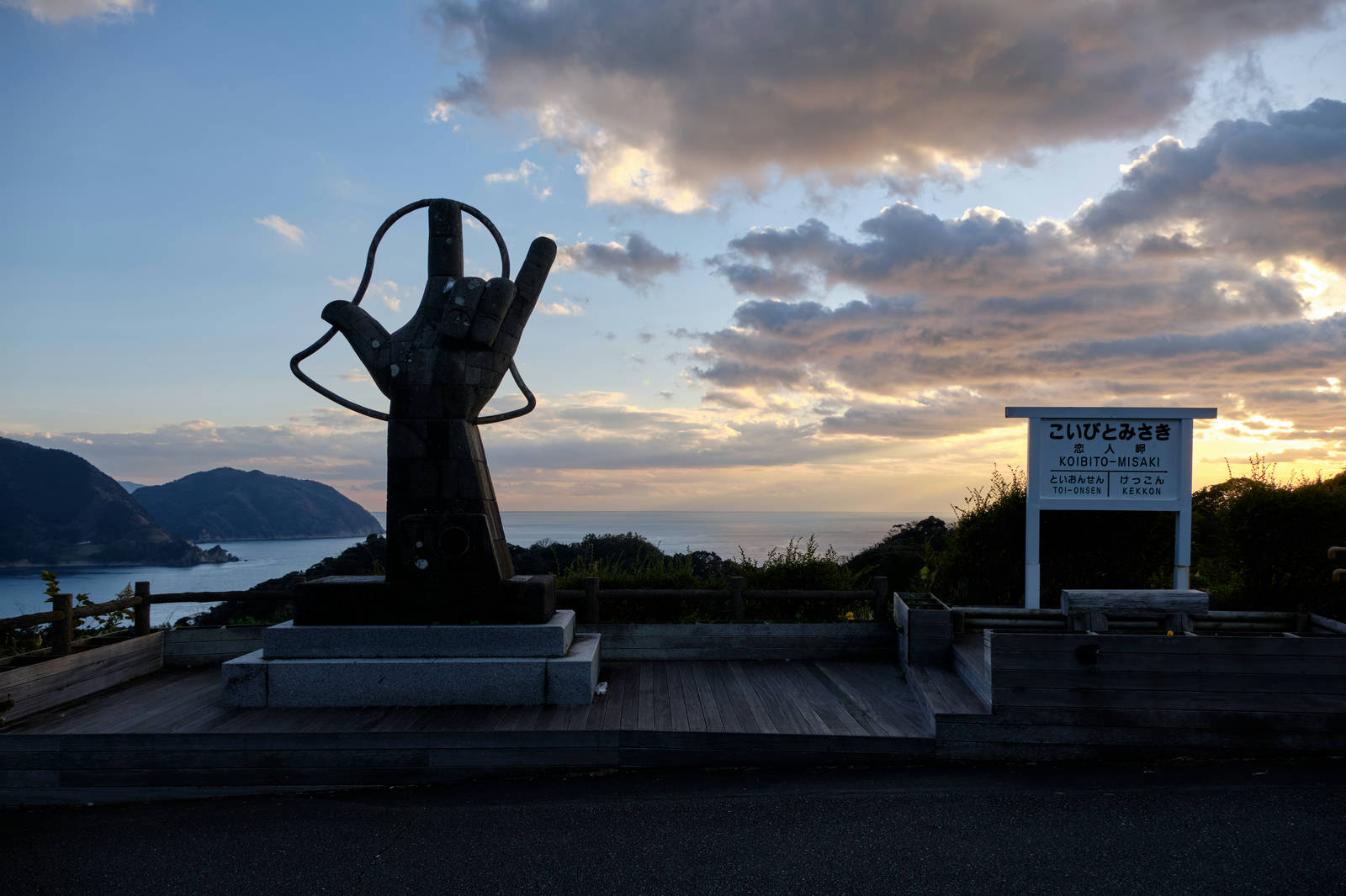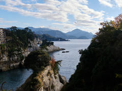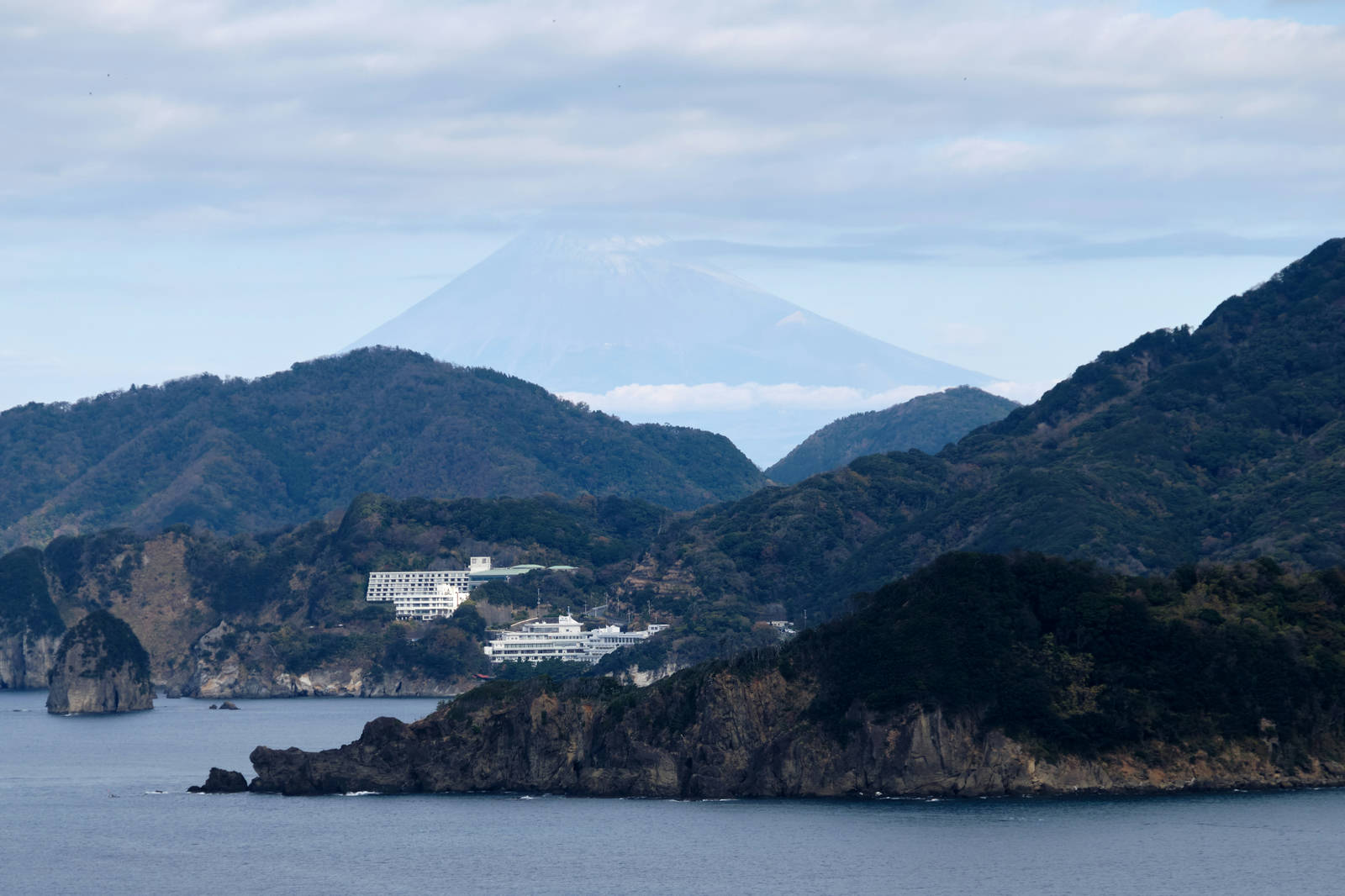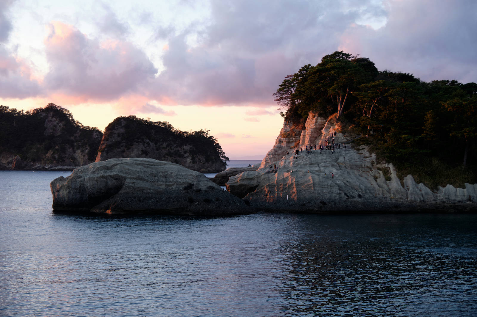 Den Fuji im Rücken weiter auf die Izu-Halbinsel. Ich hab irgendwie nicht mitbekommen wann ich die Klimazone gewechselt habe, aber nachdem ich die Wochen davor eigentlich nur kahle Bäume mit gelegentlichen Herbstresten gesehen habe, war Izu plötzlich wieder saftig grün und angenehm warm. Zudem wirkt zumindest die Westseite trotz ihrer Nähe zu Tokyo sehr abgelegen und verschlafen. Aber es führt tatsächlich eine Radroute einmal komplett außenherum, die hilft aber nur mit ihren auffälligen blauen Pfeilen auf der Straße bei der Navigation, ist ansonsten aber eher anspruchsvoll. Das ständige auf und ab an der Steilküste läppert sich und so kamen täglich mehr Höhenmeter zusammen als bei meinen Bergetappen. Lohnt sich aber bei der Landschaft. Eine meiner Übernachtungen lag an einer Bucht die sich selbst als Matsushima von Izu bezeichnet und einen atemberaubenden Sonnenuntergang bietet, den ich dann direkt auch in einer Horde anderer Fotografen genießen durfte. Der Fuji hat sich auch das eine oder andere Mal dazu herabgelassen aus seiner Wolke herauszuschauen, aber halt wieder nur aus der Ferne.